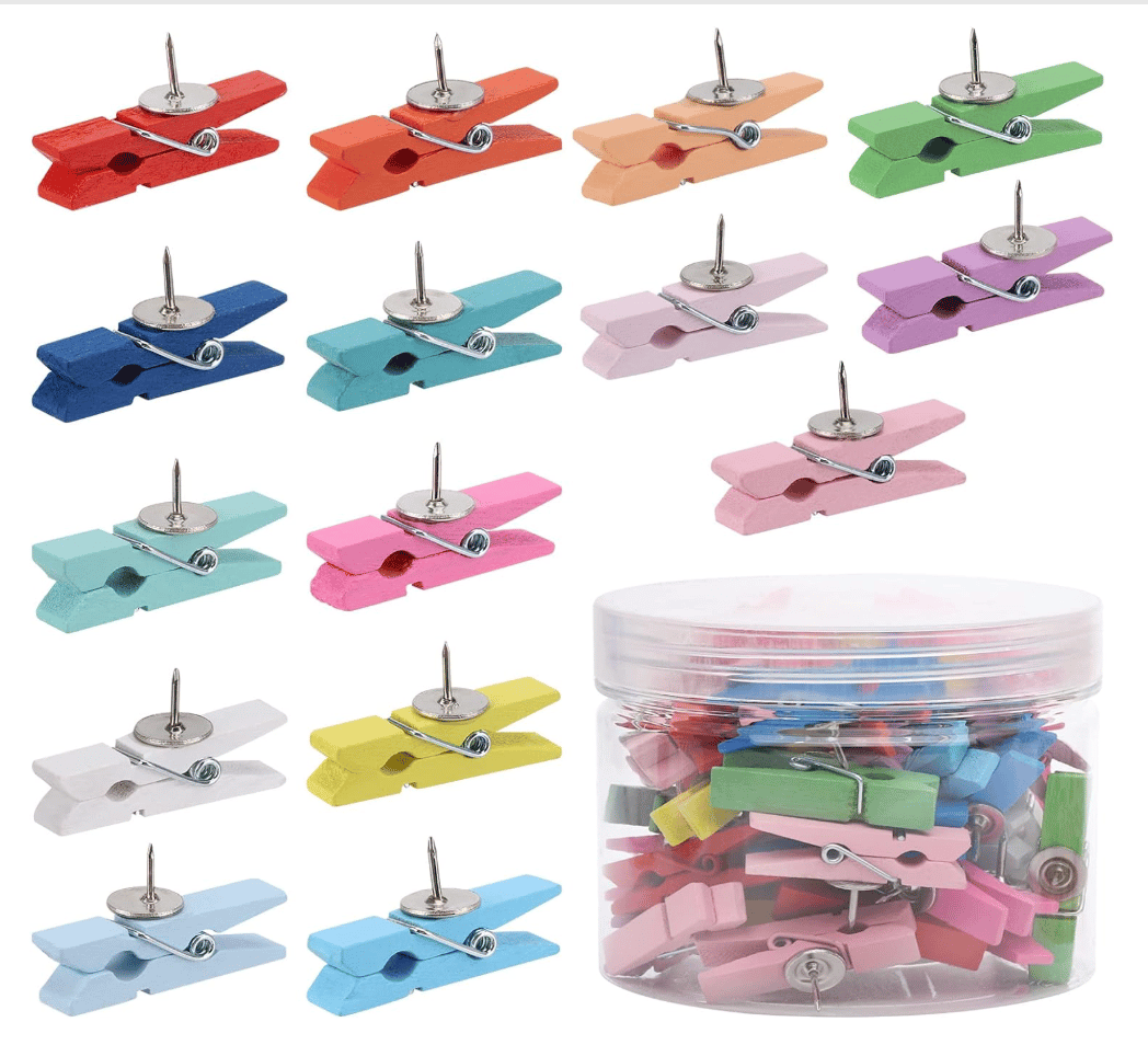 These 100 colorful wooden clip push pins are perfect for your K-2 classroom! They let you hang student artwork and notes on a bulletin board without damaging the paper, and the different pin colors help you color-code and stay organized. They come in a tidy bucket for easy, safe storage.