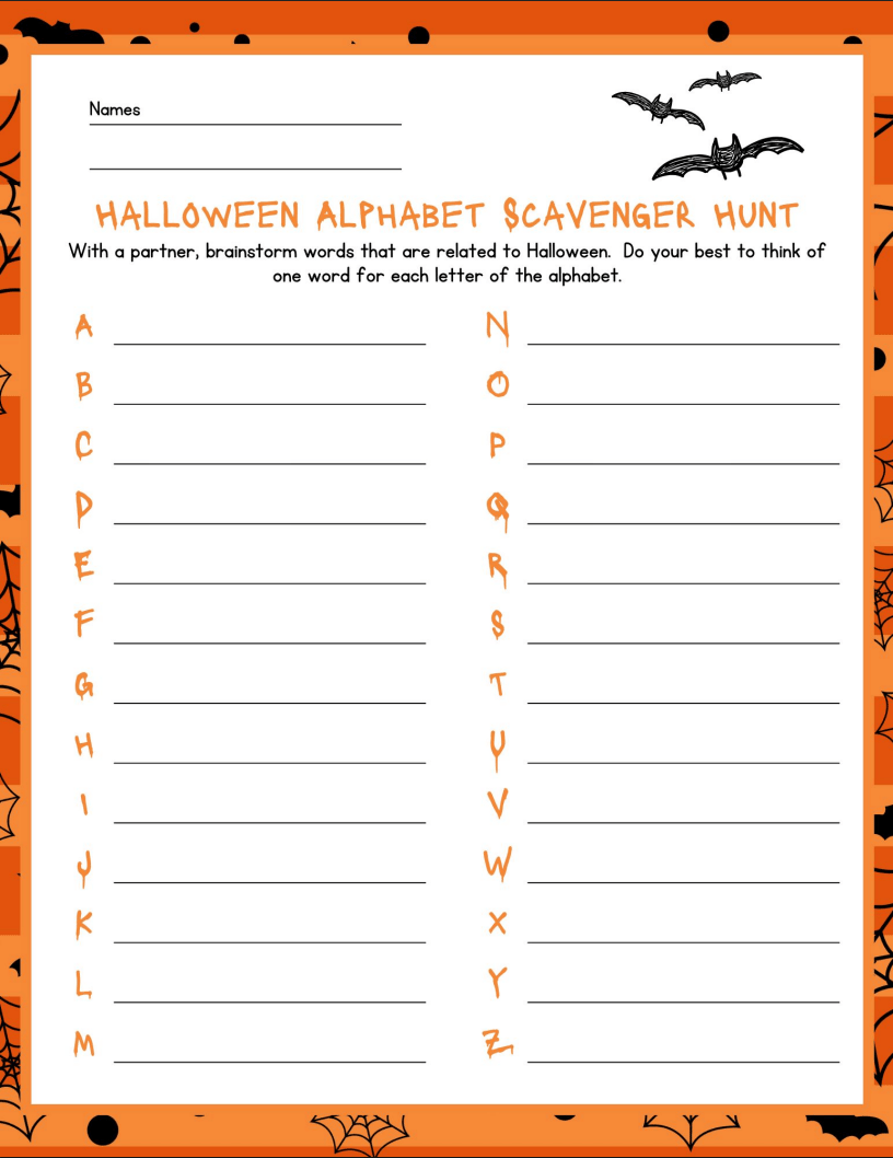 ![]() | A Halloween scavenger hunt is a fun activity for kids during the Halloween season. This alphabet scavenger hunt involves finding Halloween-themed objects for each letter. |