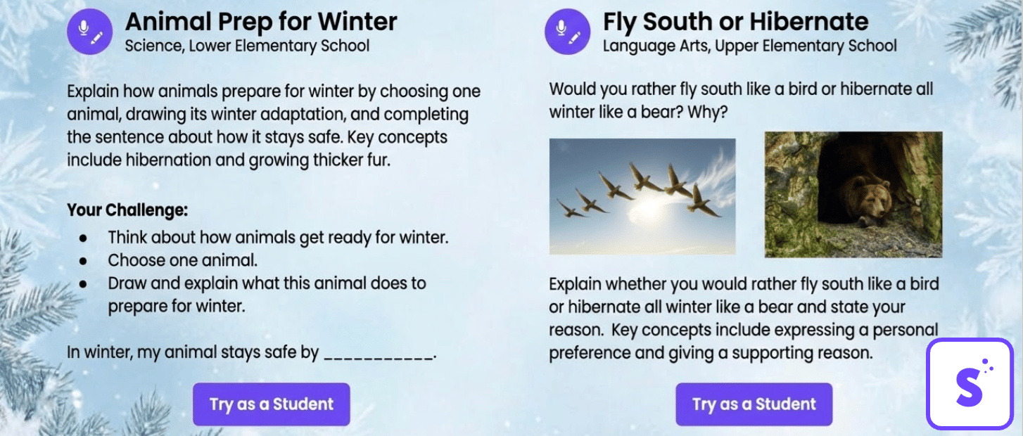 Try Snorkl’s Fly South or Hibernate or Animal Prep for Winter activities to give your students instant feedback on their thinking and get valuable insight into what they’ve learned. All your students need to do is speak their words and AI does the rest. Best of all? Snorkl is free!