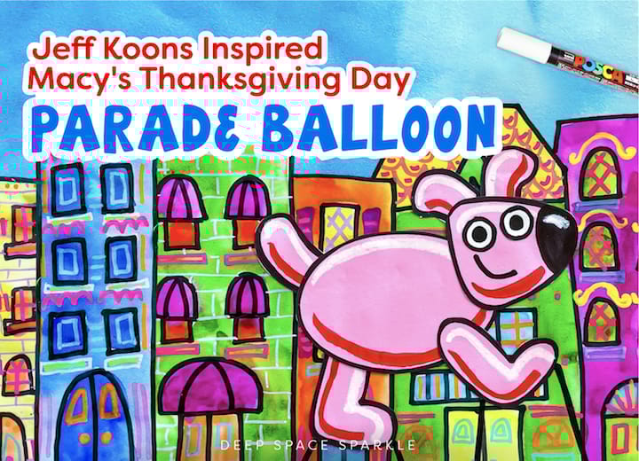 This art lesson is inspired by the Macy's Thanksgiving Day Parade balloon created by artist Jeff Koons. It guides students through creating a cityscape background and then assembling a sleek, shiny "balloon dog" using simple techniques like highlights and shadows to give it a rounded, three-dimensional look.