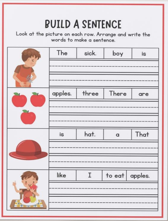 This Build a Sentence worksheet provides K-2 students with a structured way to practice syntax by arranging scrambled words that correspond to helpful visual illustrations.